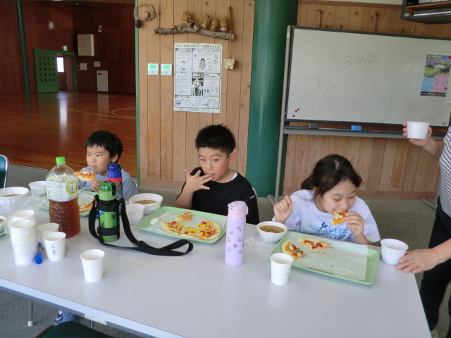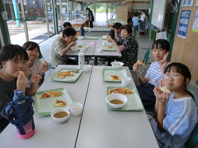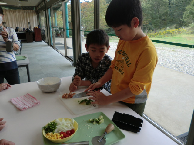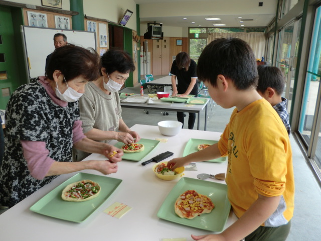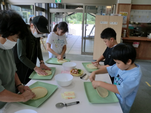10月18日(土)児童と地域の大人の方が、一緒に多根町のふれあいセンター山びこ荘へ行き、ピザ作り体験と、落ち葉を使ったランタン作りを楽しんできました。