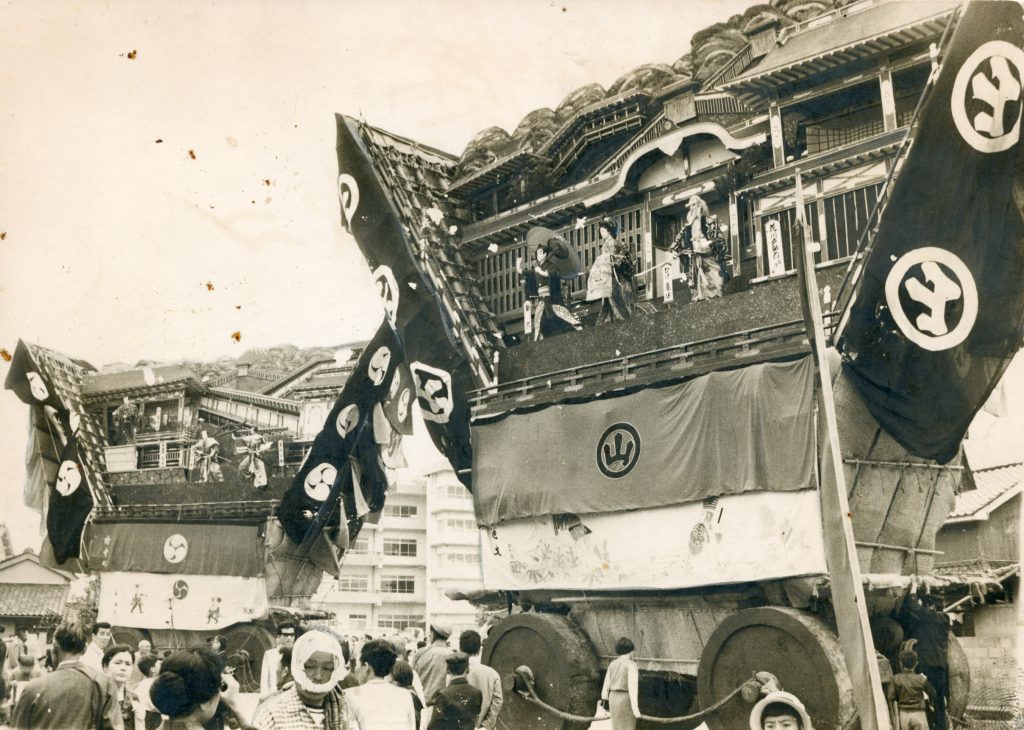 撮影場所は鳥居が見えるので山王町の山王神社前と思われます。 写真は鍜冶町のでか山です。 着物を着た人が多くいるので戦前の写真と思われます。 撮影時期は...
