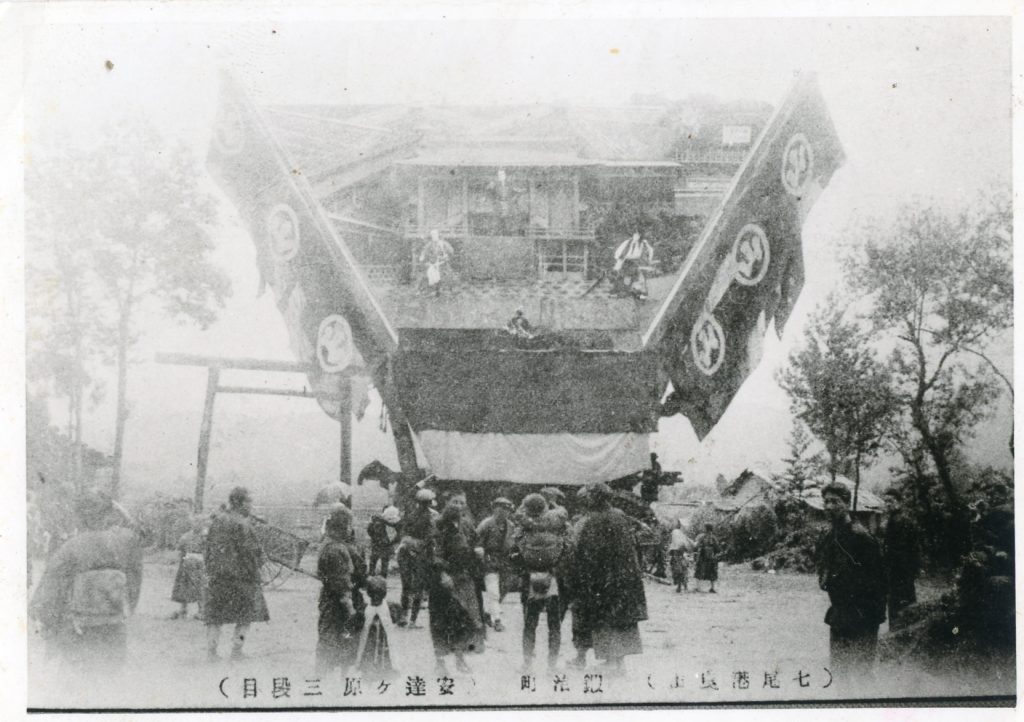 撮影場所は鳥居が見えるので山王町の山王神社前と思われます。 写真は鍜冶町のでか山です。 着物を着た人が多くいるので戦前の写真と思われます。 撮影時期は...